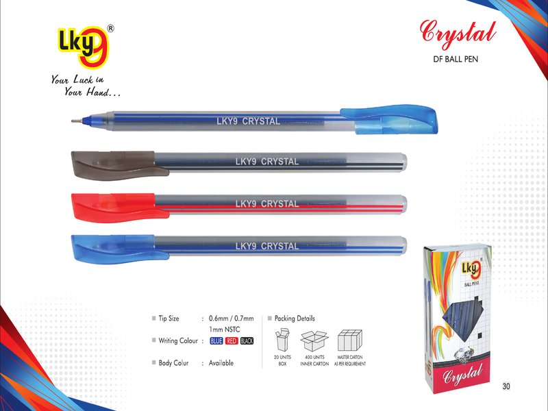Premium quality writing pen by LKD. The Crystal is manufactured by STRT Pen Wings Private Limited (ISO 9001:2015 certified), available in Blue, Red & Black ink. ISI certified for guaranteed quality.