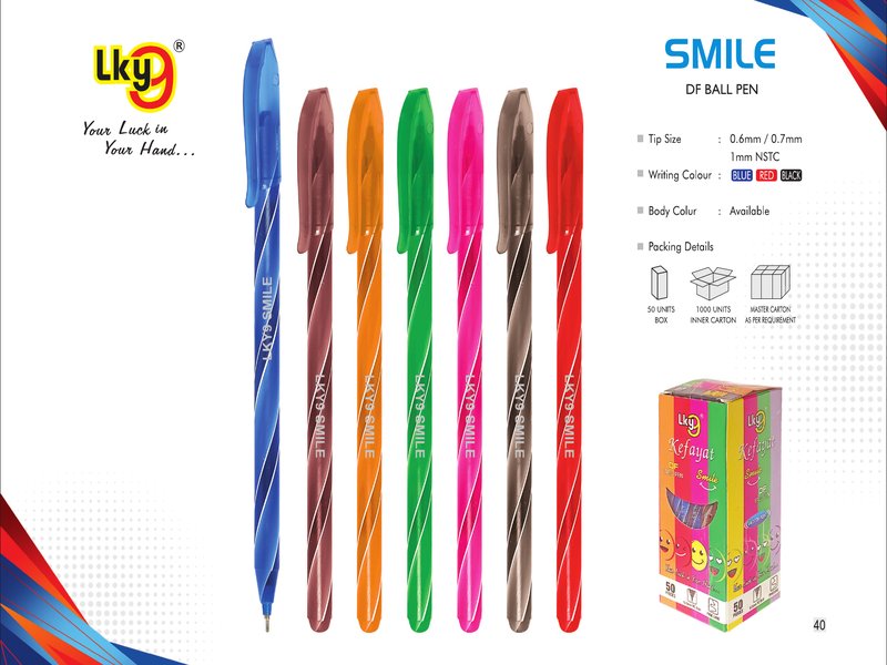 Premium quality writing pen by LKD. The Smile is manufactured by STRT Pen Wings Private Limited (ISO 9001:2015 certified), available in Blue, Red & Black ink. ISI certified for guaranteed quality.