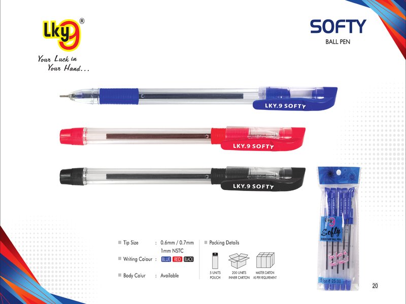 Premium quality writing pen by LKD. The Softy is manufactured by STRT Pen Wings Private Limited (ISO 9001:2015 certified), available in Blue, Red & Black ink. ISI certified for guaranteed quality.